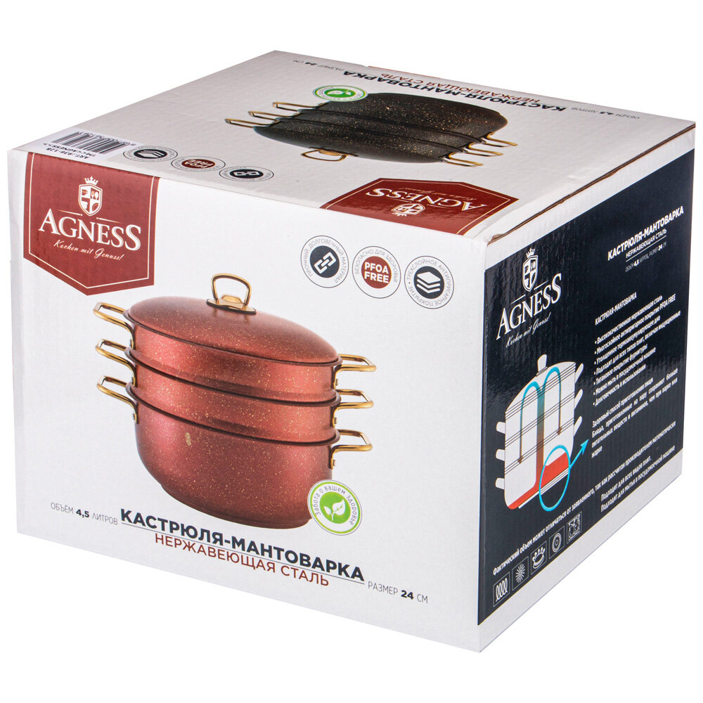 Кастрюля-мантоварка AGNESS "RED QEEN" 24X7,2/24Х12/24Х12 СМ, трехслойное покр GRANIT, PFOA FREE