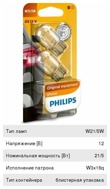 Лампа W21/5W 12V (21/5W) Vision, 2Шт. Блистер W3x16q Philips арт. 12066B2