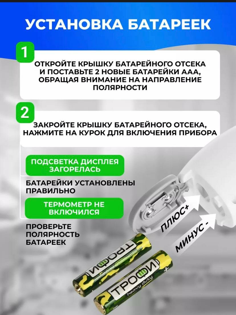 | Подробная комплектация | Термометр, 2 батарейки ААА, инструкция |
