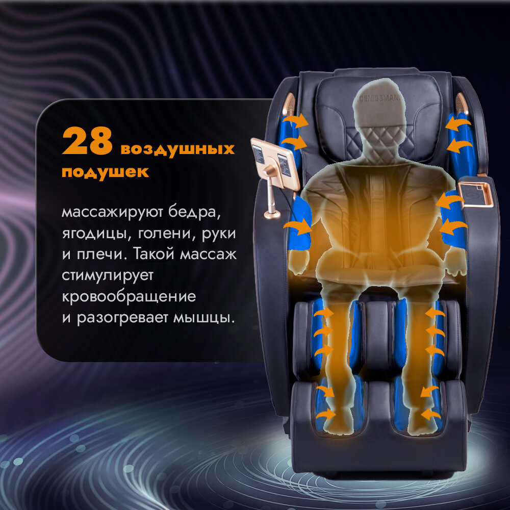 | Дополнительная информация | Кресло оборудовано 28 воздушными подушками и 6 массажными роликами, которые работают синхронно для максимального расслабления. Количество программ составляет 6, обеспечивая вам разнообразные варианты массажа в зависимости от ваших нужд. |