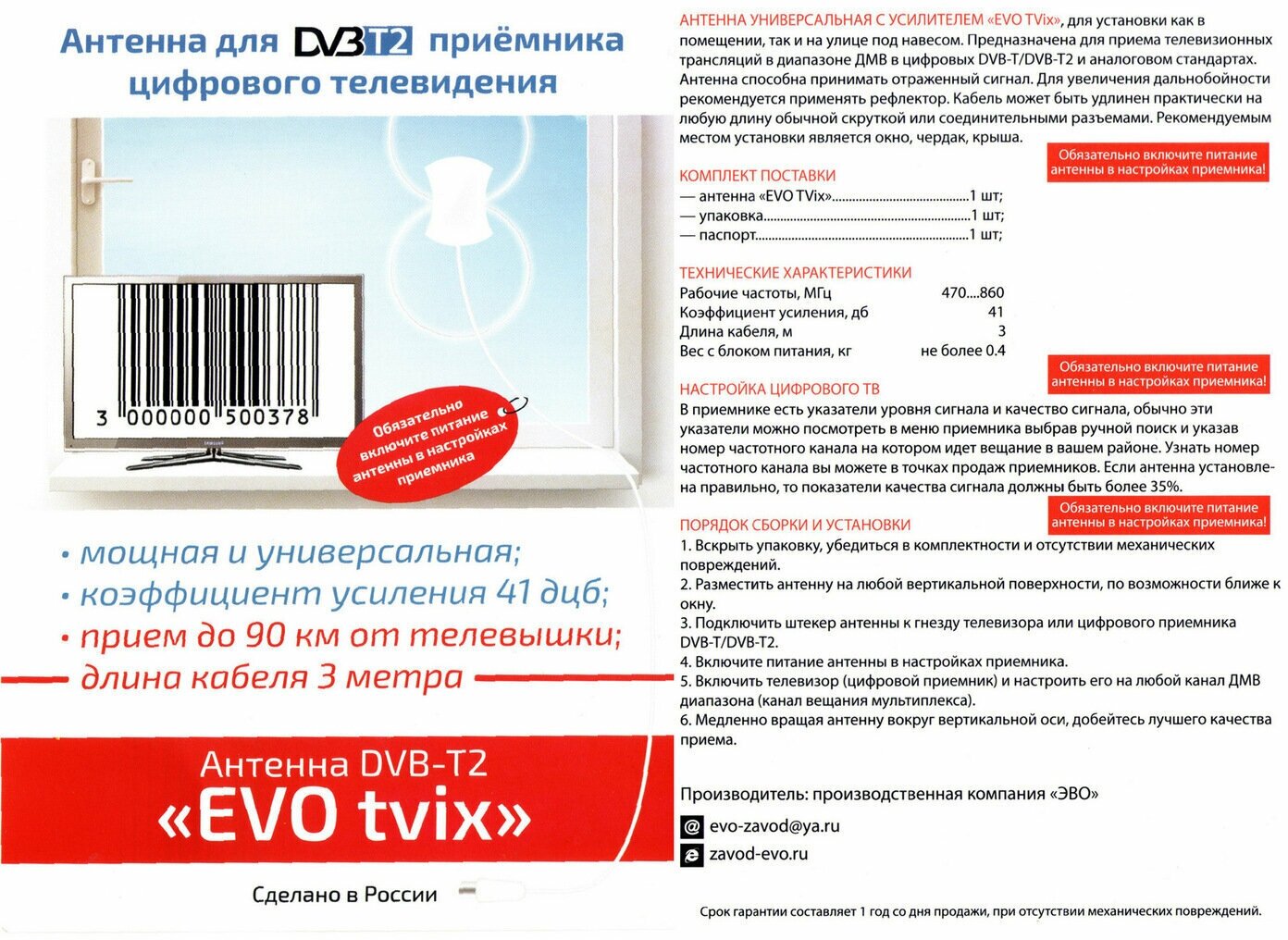 Отзывы на Антенна для цифрового ТВ комнатная EVO-TVIX двойная петля 5в. 3м