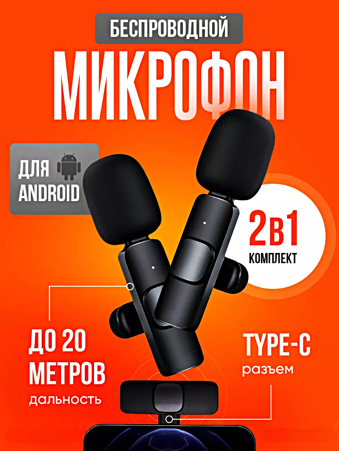 Отзывы на Микрофон беспроводной петличный, Комплект 2 микрофона петлички с разъемом Type-C для Android, Петлички для стрима, Черный