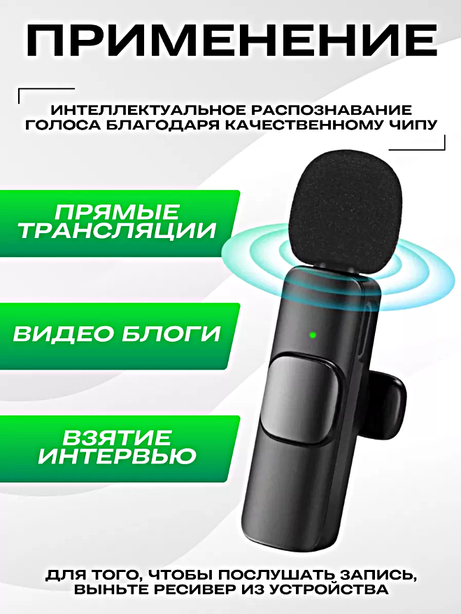Микрофон беспроводной петличный с шумоподавлением, Микрофон с разъемом Lightning для iPhone, Петличка для стрима, конференций, Черный