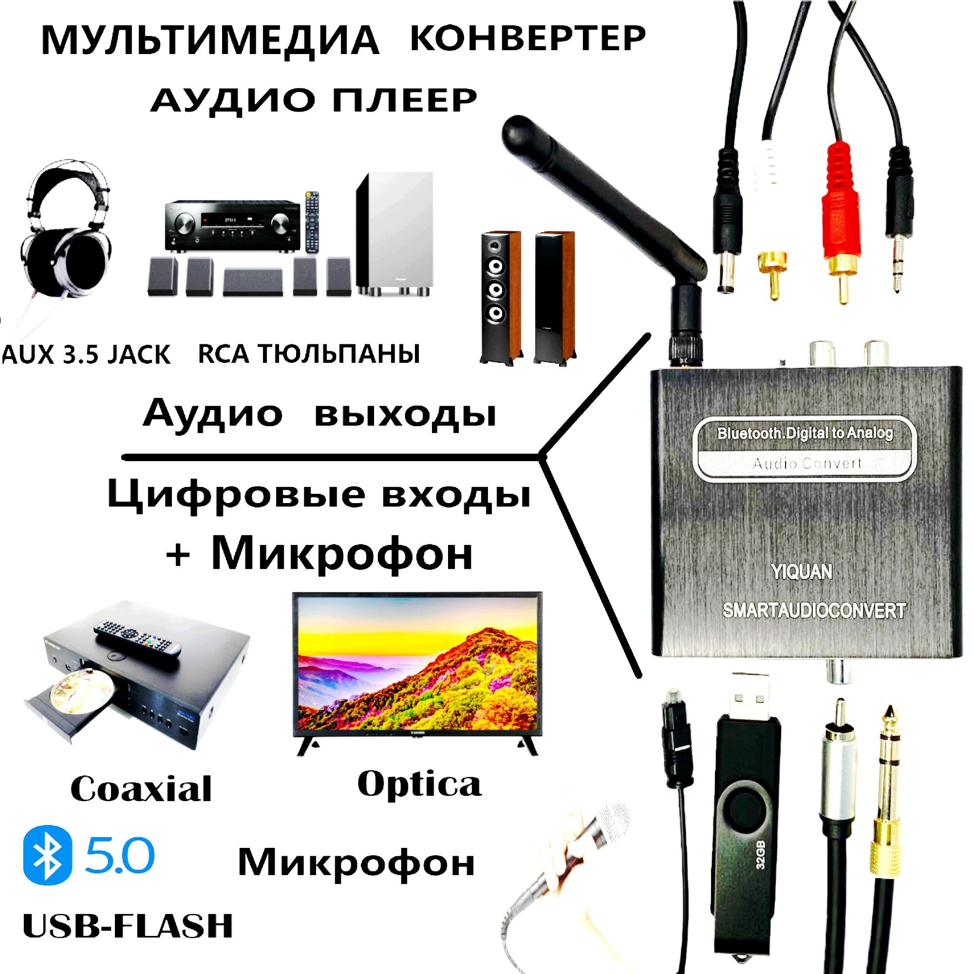 Отзывы на Мультимедиа плеер конвертер Bluetooth 5.0 USB Optical Toslink Coaxial на 3.5 jack RCA тюльпаны Караоке Микрофон с пультом управления громкостью