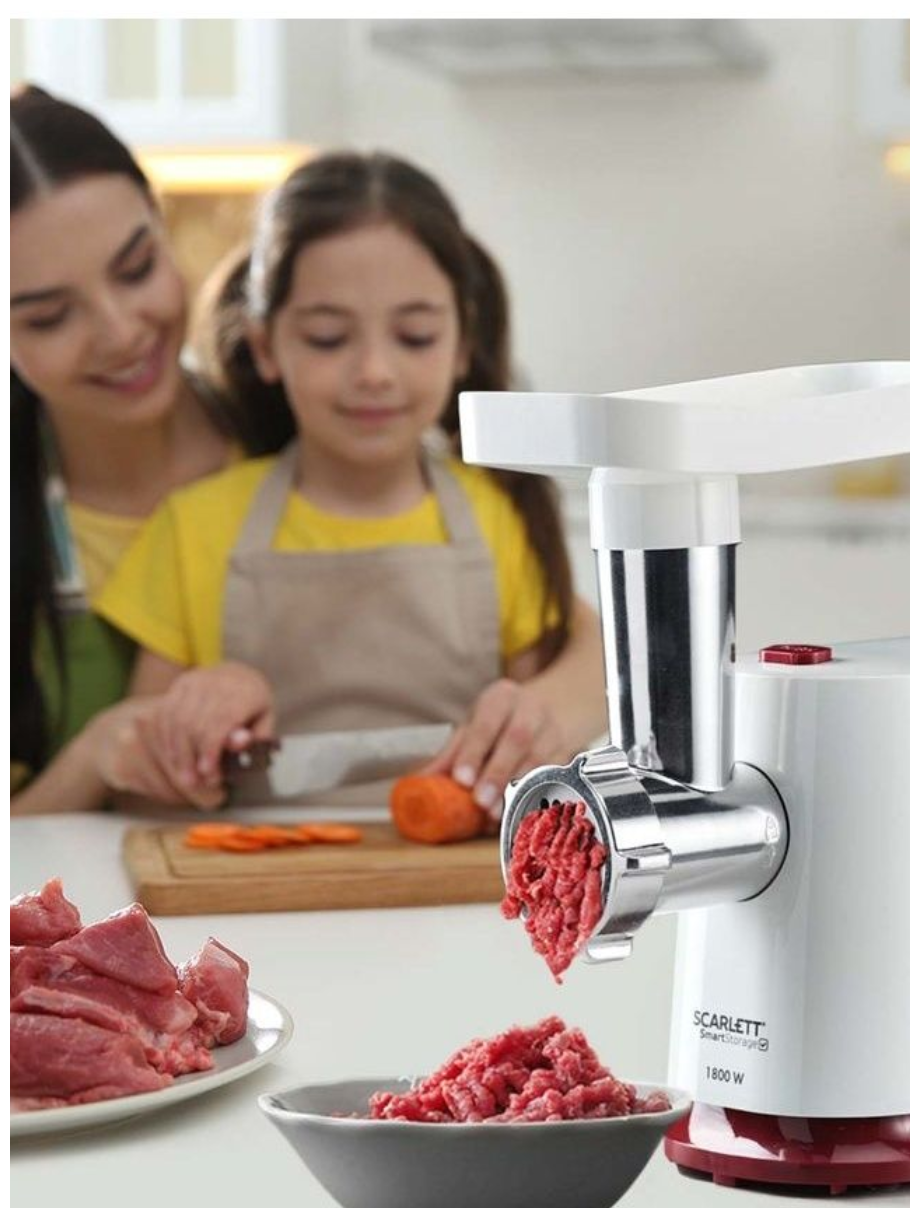 Мясорубка Scarlett 1800 Вт, производительность 2 кг/мин, 4 насадки, реверс, пластик, белая, бордо 6 361 ₽