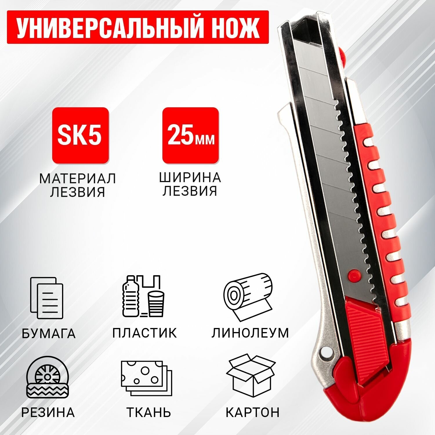 Нож с сегментированным лезвием 25мм металлический обрезиненный корпус с дополнительным замком на лезвии 12-4918, REXANT 124918 (1 шт.)