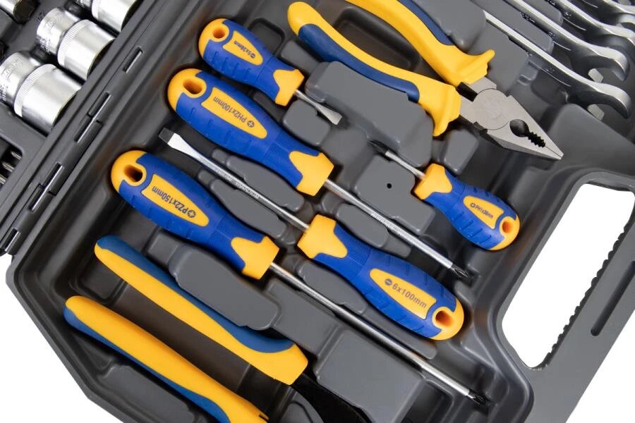 | Инструменты в комплекте | молоток / отвёртки / рукоять для бит / трещотка / пассатижи / ключи гаечные / ключ переставной гаечный / ключи имбусовые (шестигранные) |