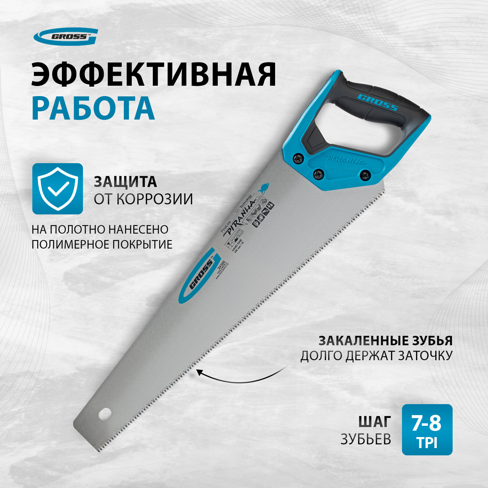 Gross Ножовка по дереву "piranha", 450 мм, 7-8 Tpi, зуб - 3D, каленый зуб, 2-х комп. рук-ка// 24100