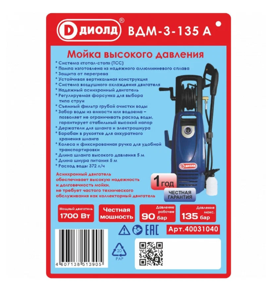 Мойка высокого давления диолд ВДМ-3-135 А [40031040] информация: