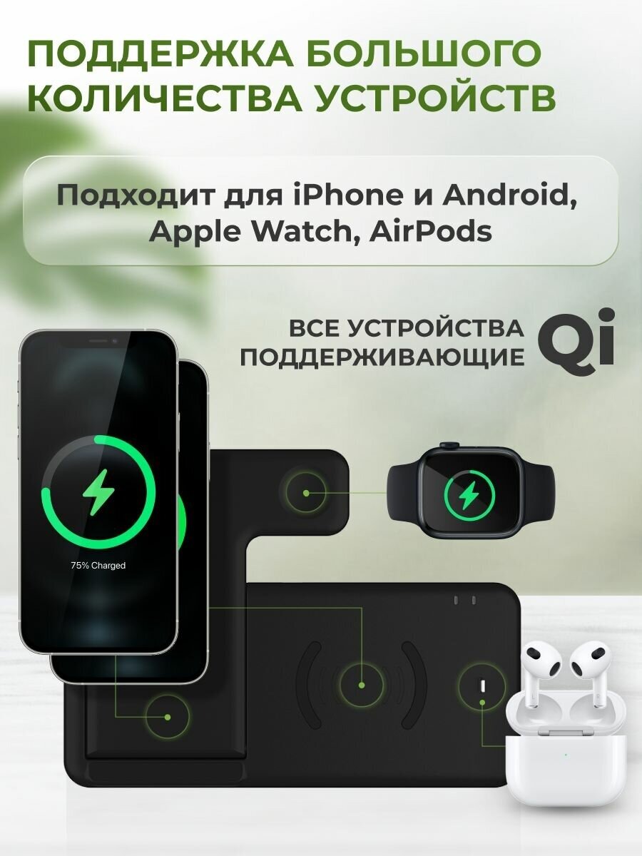 Беспроводная зарядка 4 в 1 для телефонов /зарядник для смартфона и наушников iPhone, Xiaomi/Док станция для AirPods Pro и часов Apple Watch информация: