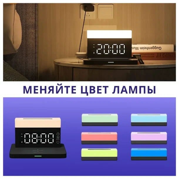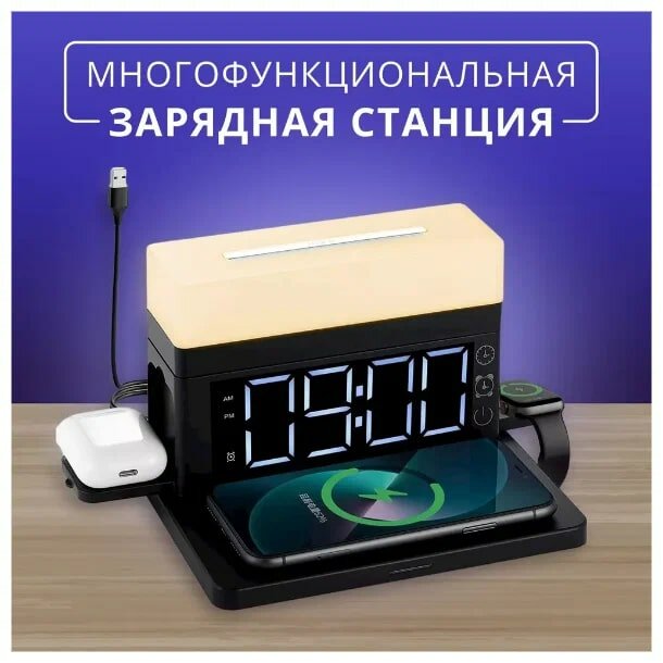 Отзывы на Станция беспроводной зарядки для устройств Iphone / Iwatch / AirPods, 5 в 1 с ночником и будильником, цвет черный.