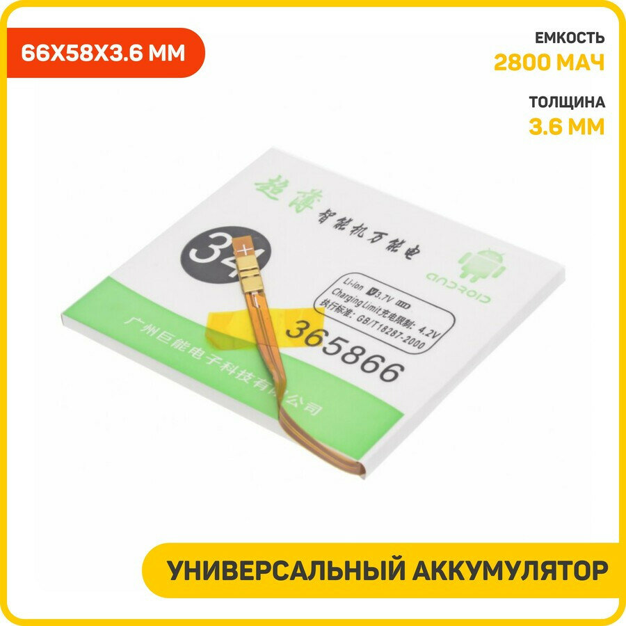 Универсальный аккумулятор (банка) 3.7 B, 2800 мАч, 66x58x3.6 мм (контакты на шлейфе) информация: