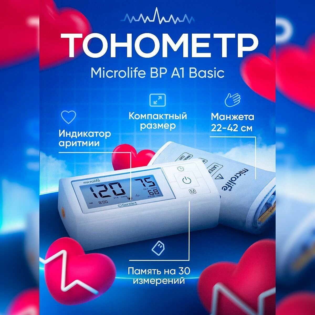 Тонометр автоматический медицинский Microlife BP A1 Basic для измерения артериального давления с манжетой M/L (22-42 см)