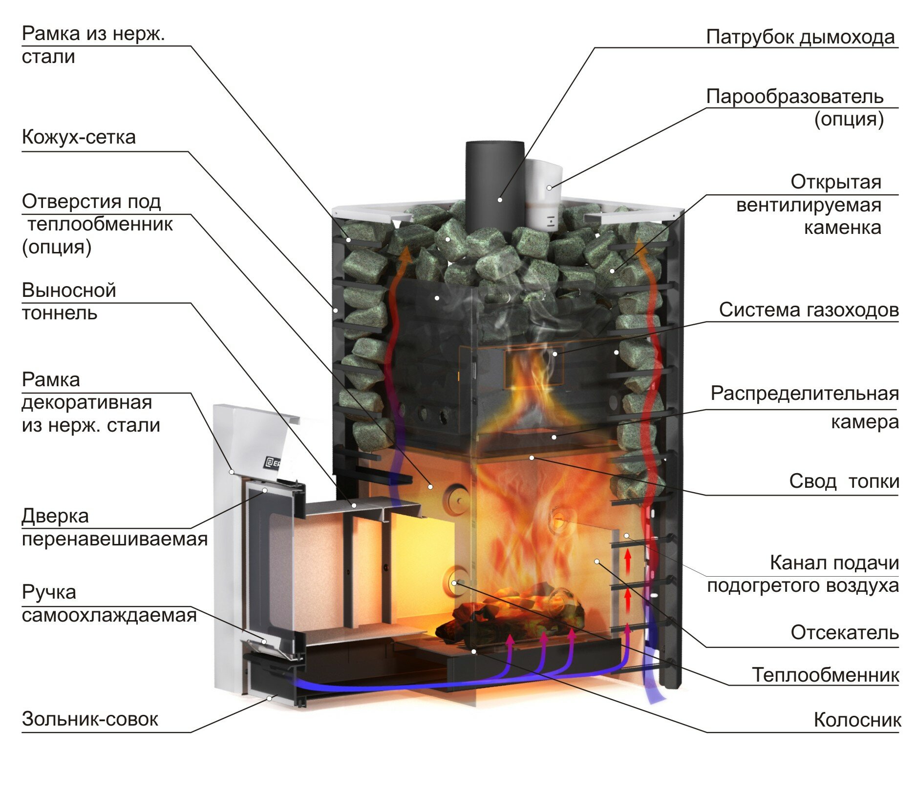 | Дополнительная информация | самоохлаждаемая ручка, емкость каменки 180 кг, каменка и сложные дымовые каналы сделаны из конструкционной стали, модульность — возможность усовершенствования печи с помощью дополнительных опций (навесной бак, сетка-каменка, модуль закрытой каменки, парообразователь, выносной бак, теплообменник, конвектор или экономайзер на трубу дымохода и др.) |