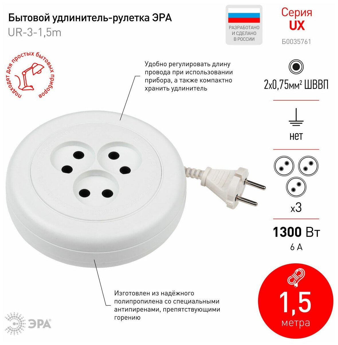 Удлинитель электрический ЭРА UR-3-1,5m рулетка без заземления 3 розетки 1,5м ШВВП 2x0,75мм2 6А информация: