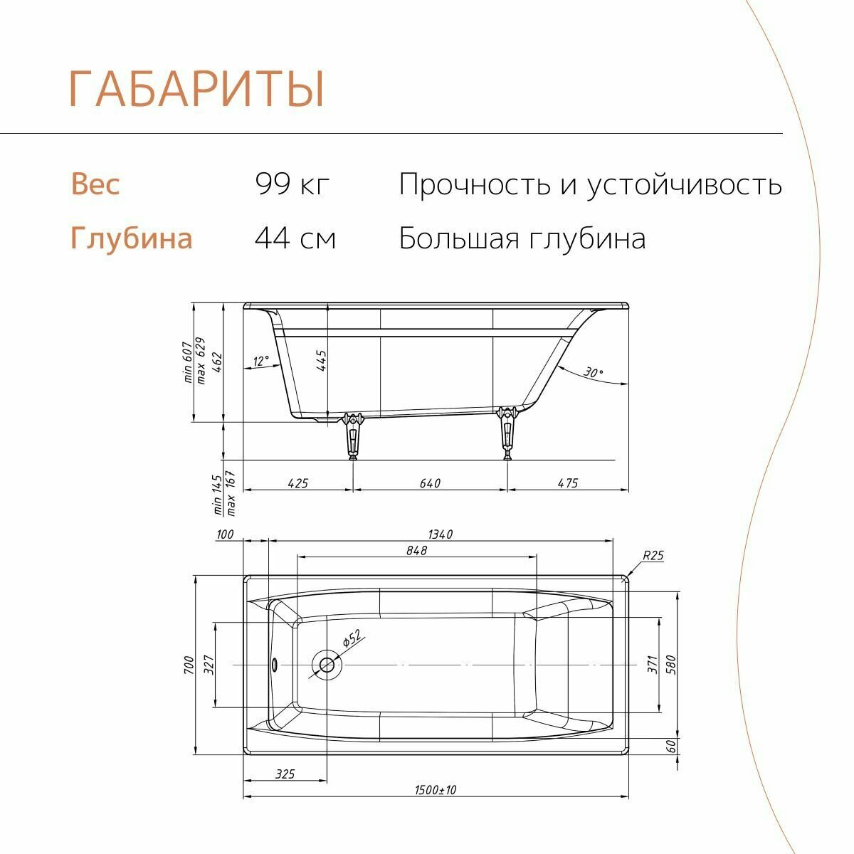 Ванна чугунная tempra Supreme 150x70 квадратные ручки информация:
