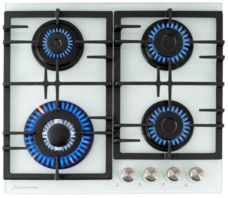 Варочная панель газовая встраиваемая Schaub Lorenz / Шауб Лоренц SLK GL6511 закаленное стекло белый 100х580х510мм 4 конфорки 2 решетки / газ-контроль / электроподжиг / газовая плита
