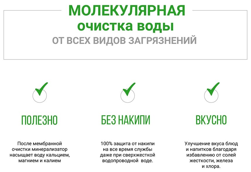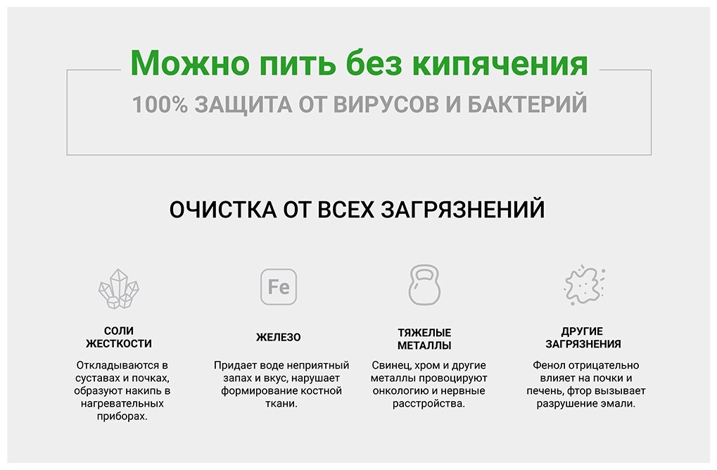 | Дополнительная информация | система монтируется под стандартной мойкой 60x60 см, при желании накопительный бак можно разместить на расстоянии до 5 метров; замена картриджей осуществляется один раз в год; макс. температура воды на входе: 40 °C; макс. температура воды на выходе: 40 °C; мин. температура воды на выходе: 4 °C; мин. давление на входе: 2 атм; макс. давление на входе: 25 атм; рекомендуемая производительность: 0.14 л/мин |