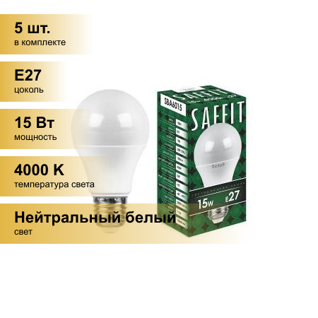 (5 шт.) Светодиодная лампочка Saffit ЛОН А60 E27 15W(1500Lm) 4000K 4K матовая 112x60 SBA6015 55011 информация: