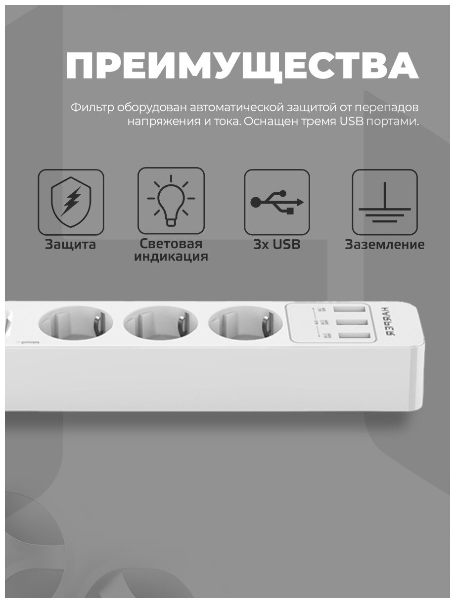 | Дополнительная информация | отверстия для крепления на стену; выключатель с защитой от перегрузок; индикатор защиты от перепада напряжения; максимальная сила тока на 1 USB порт 2.4 А, суммарная сила тока для всех портов USB 3.4 А |