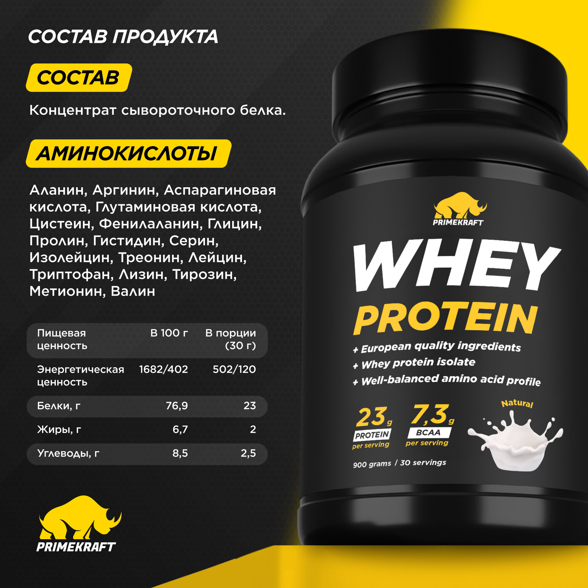 10 цен на Протеин сывороточный PRIMEKRAFT Whey Protein, Чистый, без вкуса (Pure), банка 900 г / 30 порций