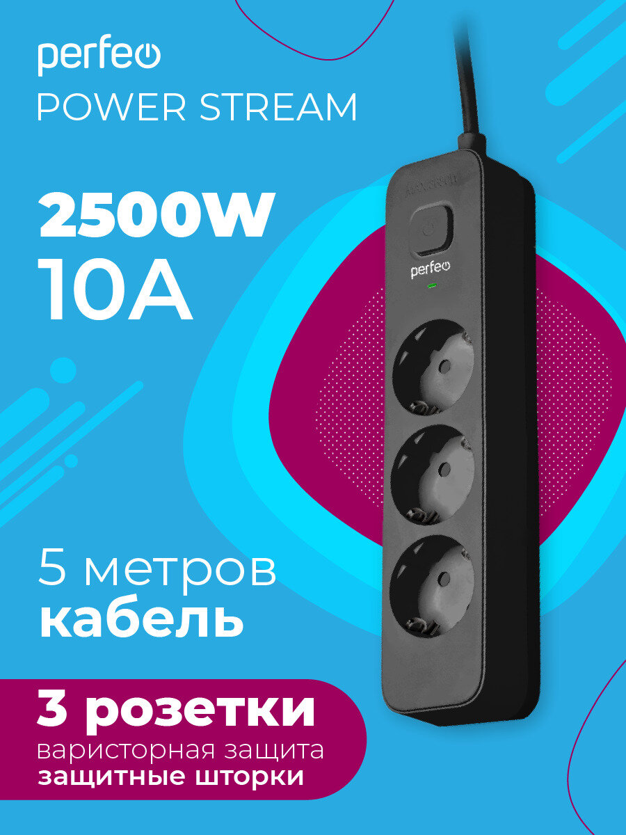 Сетевой фильтр Perfeo "POWER STREAM", 2500W, 5.0м, 3 розетки, черный (PF_C3954)