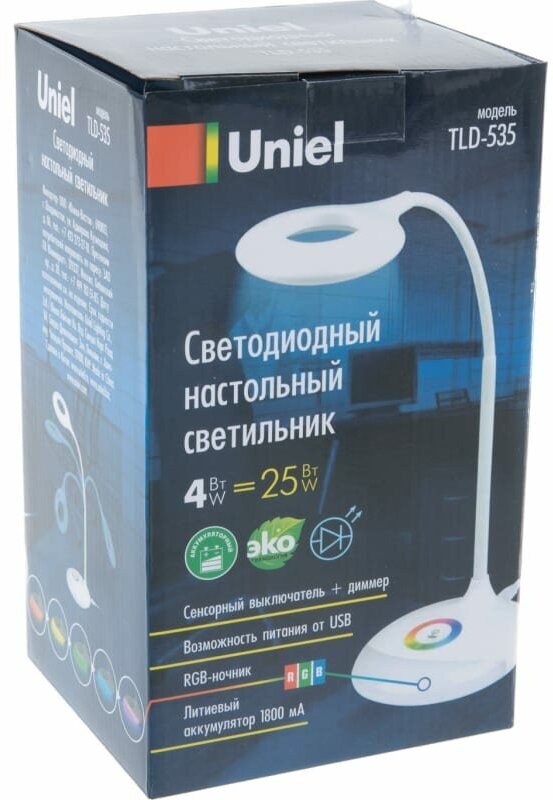 Типы/Настольные лампы/Офисные Uniel TLD-535 White/LED/250Lm/5500K/Dimmer Светильник настольный с ночником RGB, 4W. Встроенный аккумулятор 1800mAh. Сенсорный выключатель. Белый. TM Uniel.