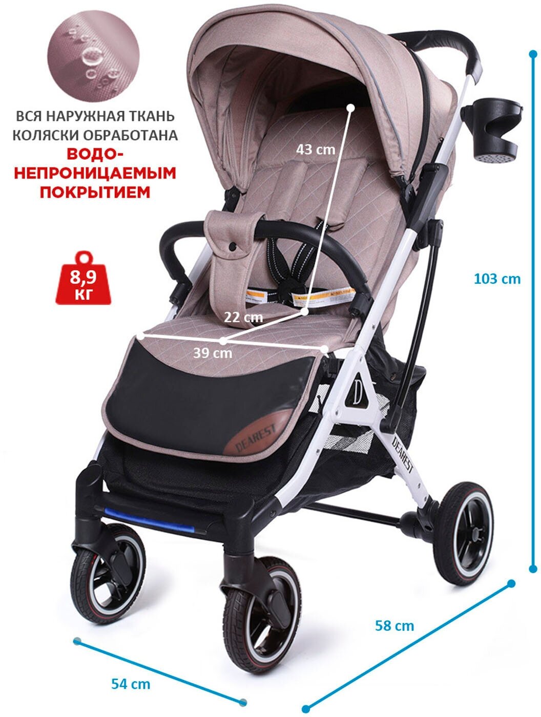 Коляска прогулочная Dearest 819 PLUS модель 2023, с механической спинкой, большим капюшоном, полная комплектация, белая рама (шампанское) информация: