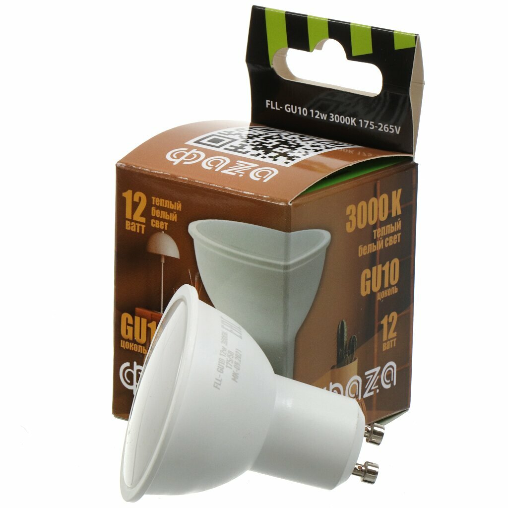 Лампа светодиодная GU10, 12 Вт, 175-265 В, 3000 К, свет теплый белый, ФАZА, FLL- GU10 информация: