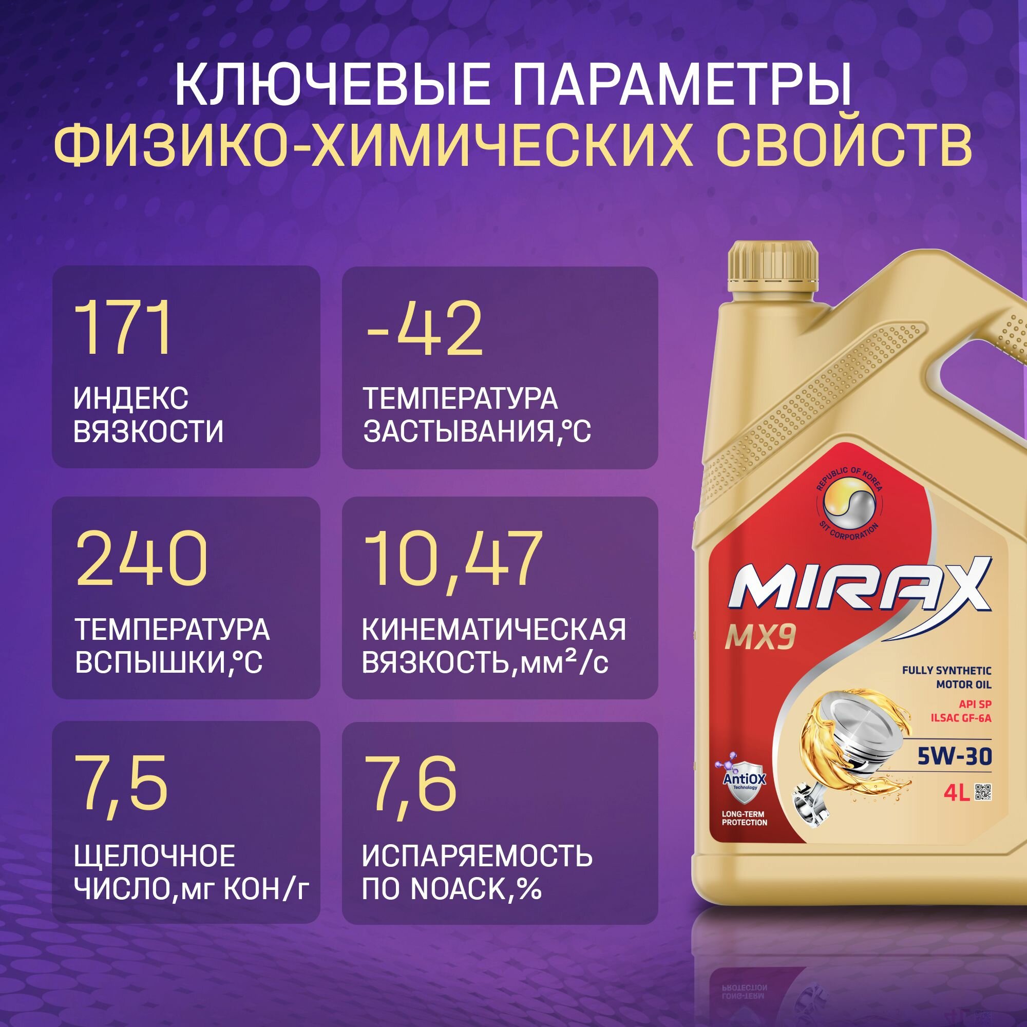 Масло моторное MIRAX MX9 SAE 5W-30 API SP, ILSAC GF 6A 4 л 607029 информация: