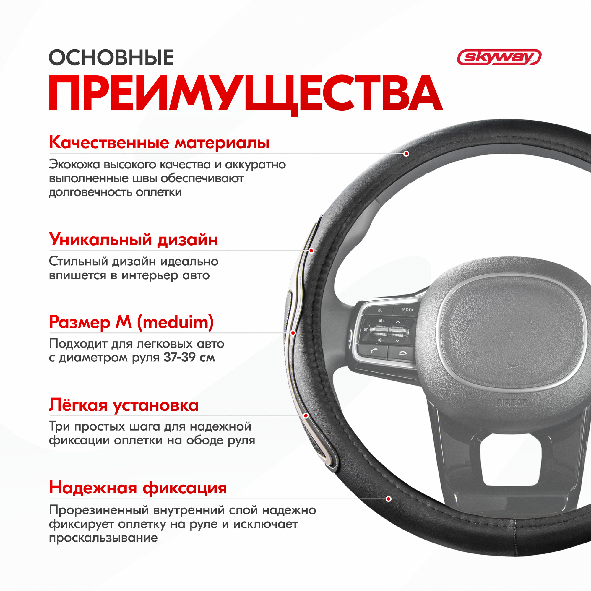 | Дополнительная информация | Рекомендации производителей: выбирайте оплётку под размер вашего рулевого колеса. Неверно выбранный размер может стать причиной проскальзывания оплётки или привести к невозможности снять или надеть её на руль. |
