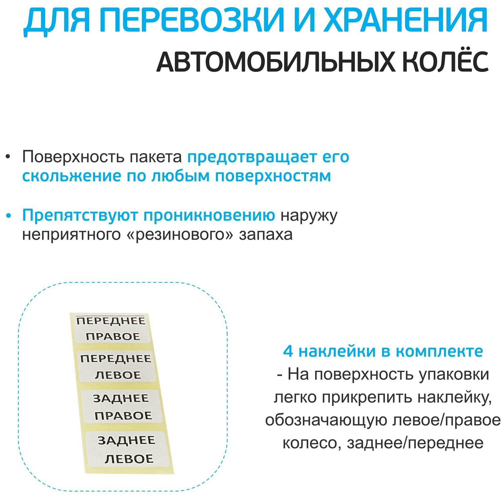 | Дополнительная информация | Специальные мешки для автомобильных колёс — это действительно выгодное со всех сторон приобретение. Они крайне недороги, и исключительно эффективны, также предназначены для перевозки и хранения автомобильных колёс. |