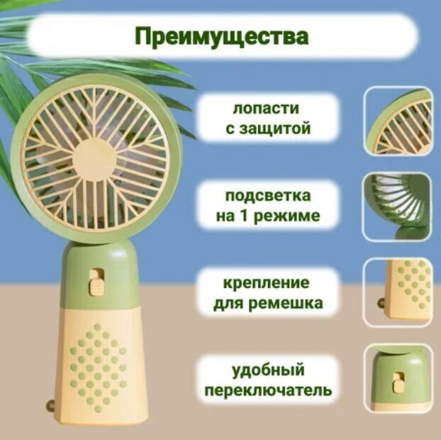 Вентилятор ручной мини маленький беспроводной настольный юсб usb, на аккумуляторе с фонариком, мощный, зеленый 1 490 ₽