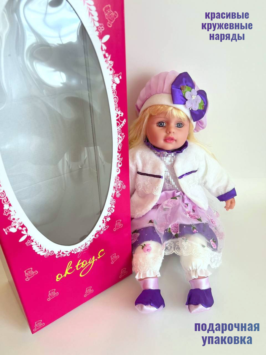 Большая кукла 60 см в сиреневой курточке и шапочке, интерактивная в подарочной упаковке, в платье, говорит