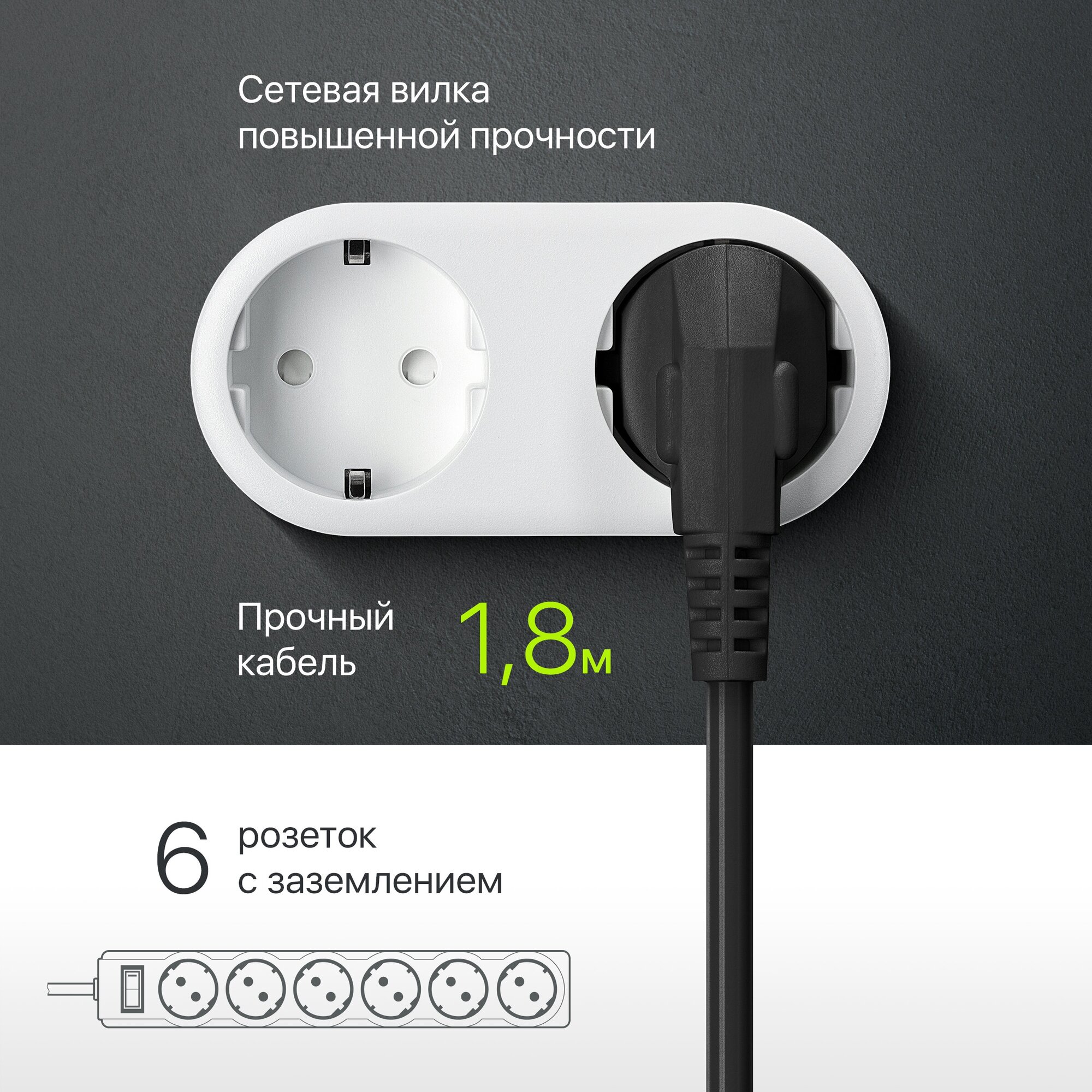 Сетевой фильтр DEFENDER DFS151, 6 розеток, ПВС 3*1,0 мм2, мощность 2200 Вт, ток 10А, чёрный, 1.8 м 977 ₽