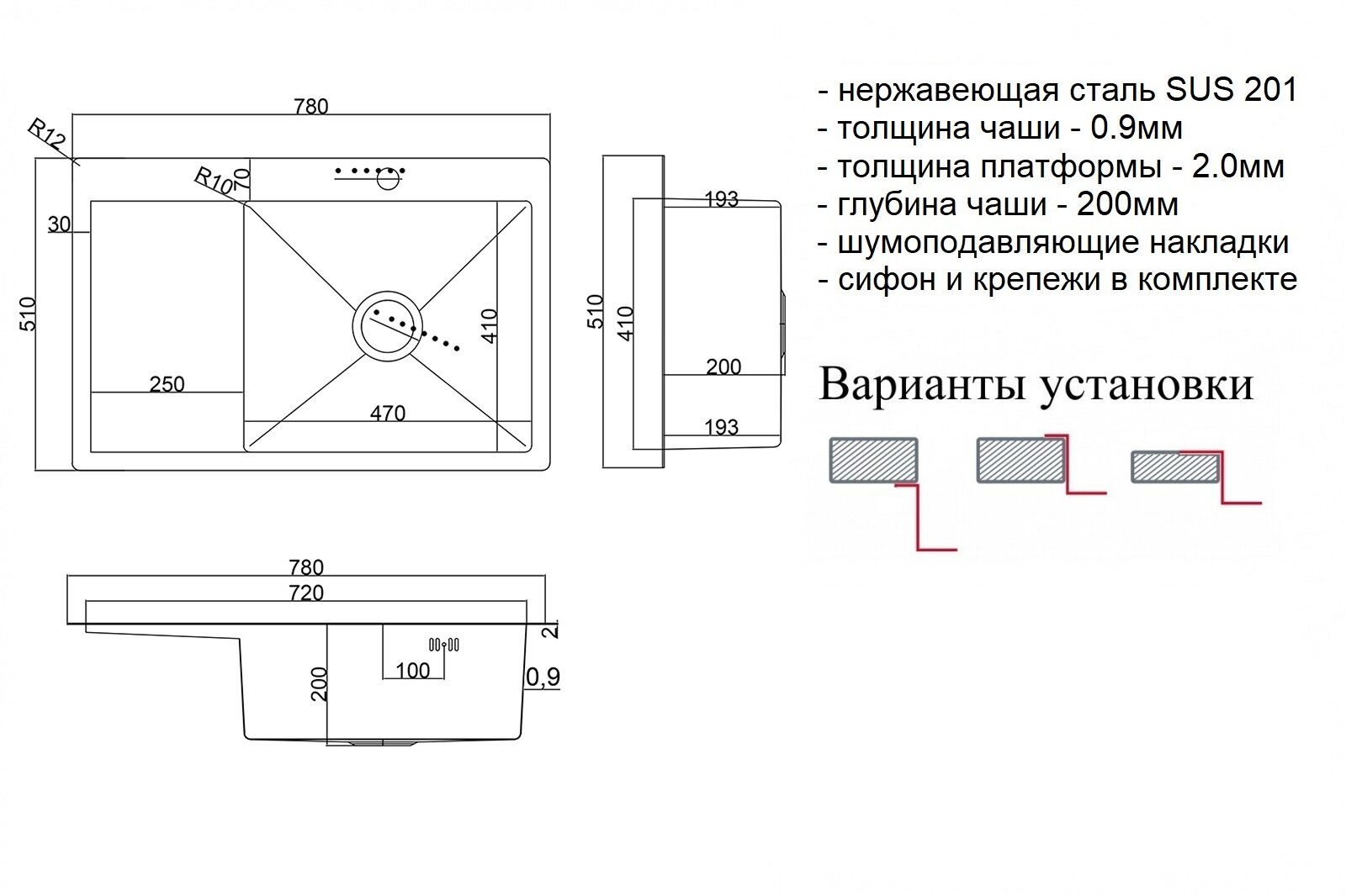 Мойка кухонная ZorG серия STEEL HAMMER SH 7851-R GRAFIT графит черная, чаша справа, крыло слева информация: