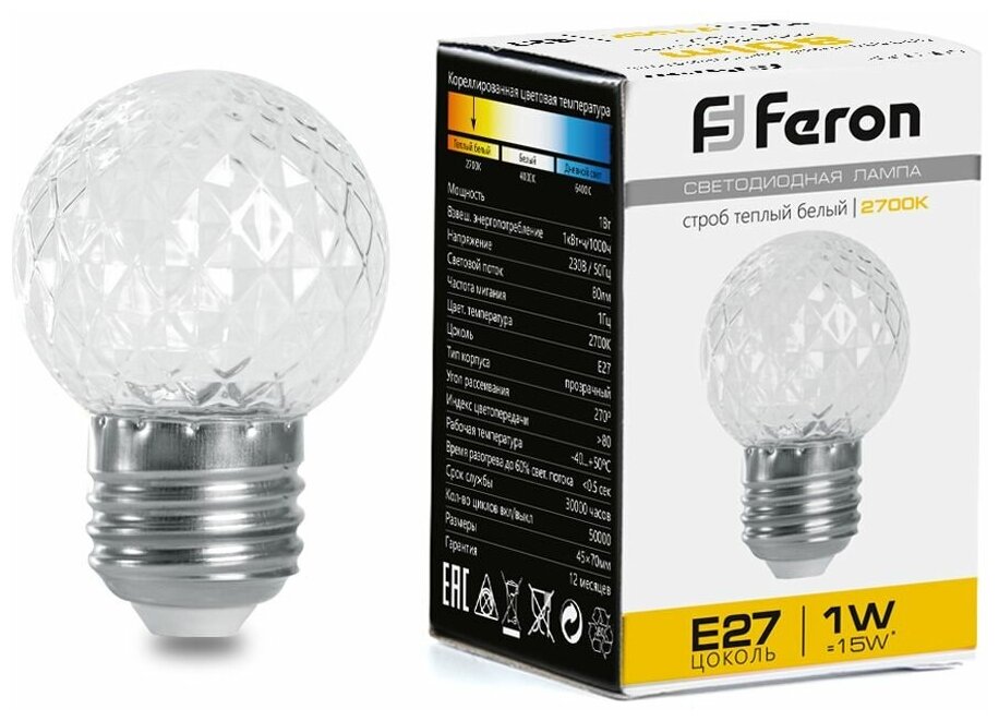 Feron Лампочка светодиодная шар E27/G45 1Вт 80Лм белый теплый 2700К, 25878