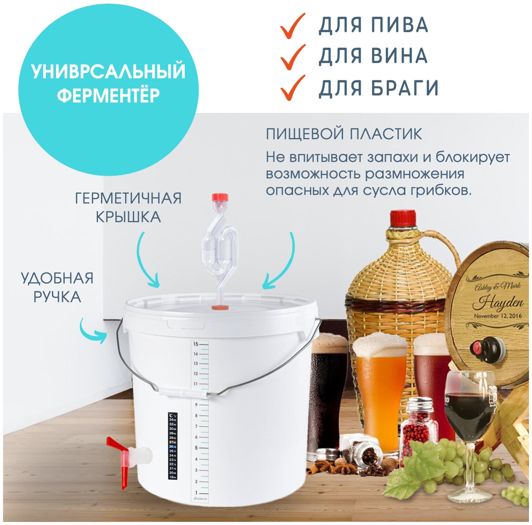Пластиковая ёмкость - бак для брожения 15л / Готовый комплект для приготовления браги и пива / Ферментер. информация: