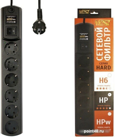 Сетевой фильтр MOST Hard HPw, 6 розеток, с/з, 10А / 2200 Вт черный 2 м