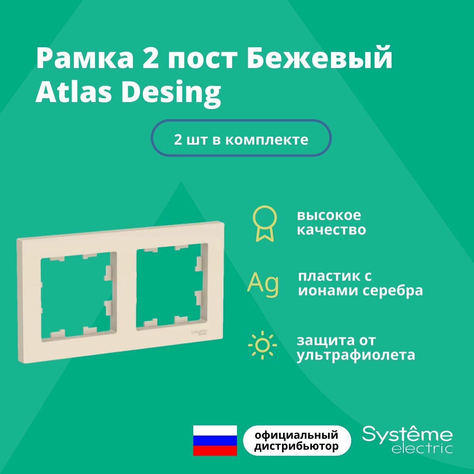 Рамка для розетки выключателя двойная Schneider Electric (Systeme Electric) Atlas Design Антибактериальное покрытие бежевый ATN000202 2шт информация:
