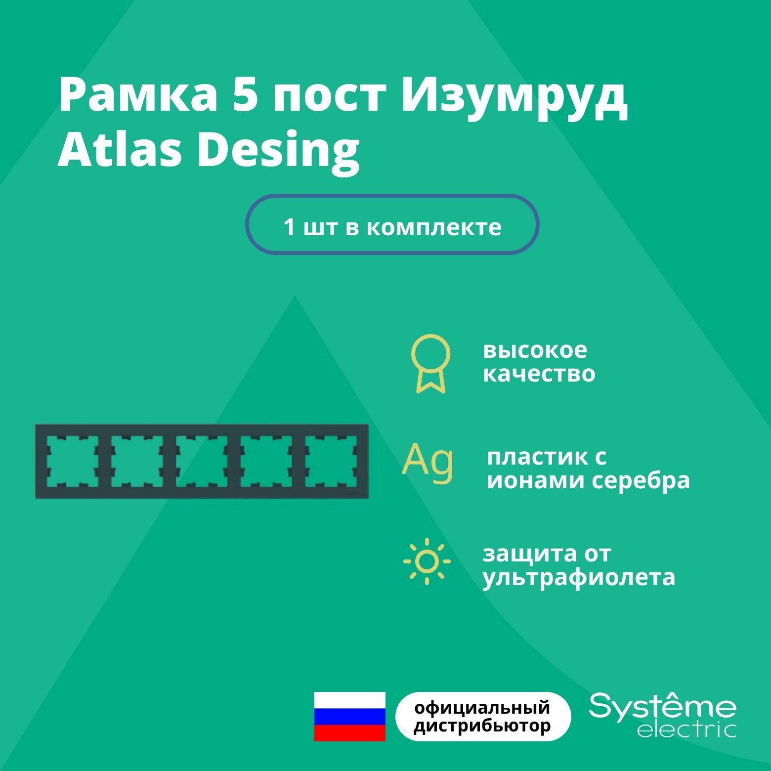 Рамка для розетки выключателя пятерная Schneider Electric (Systeme Electric) Atlas Design Антибактериальное покрытие Изумруд ATN000805 1шт информация: