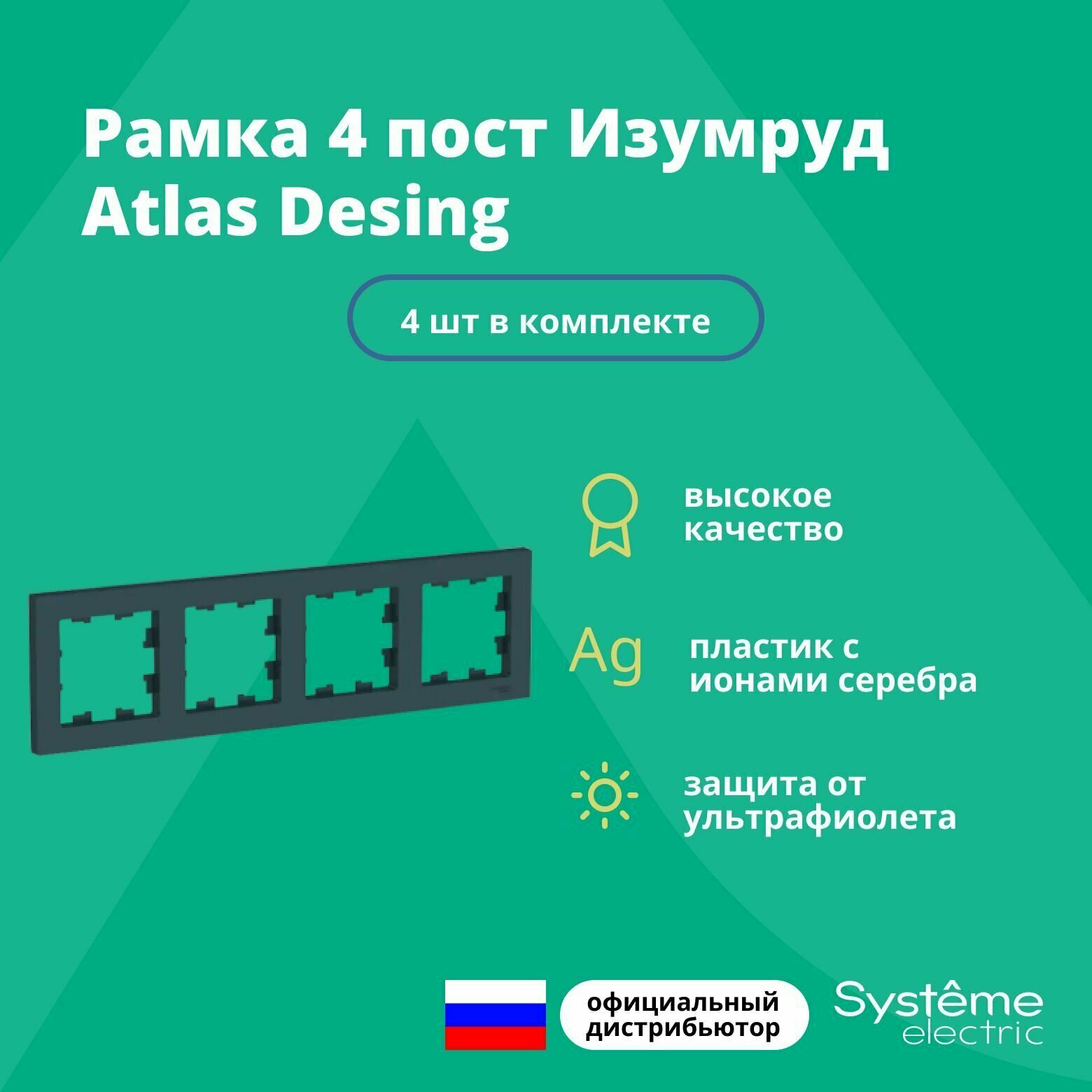 Рамка для розетки выключателя четверная Schneider Electric (Systeme Electric) Atlas Design Антибактериальное покрытие Изумруд ATN000804 4шт информация: