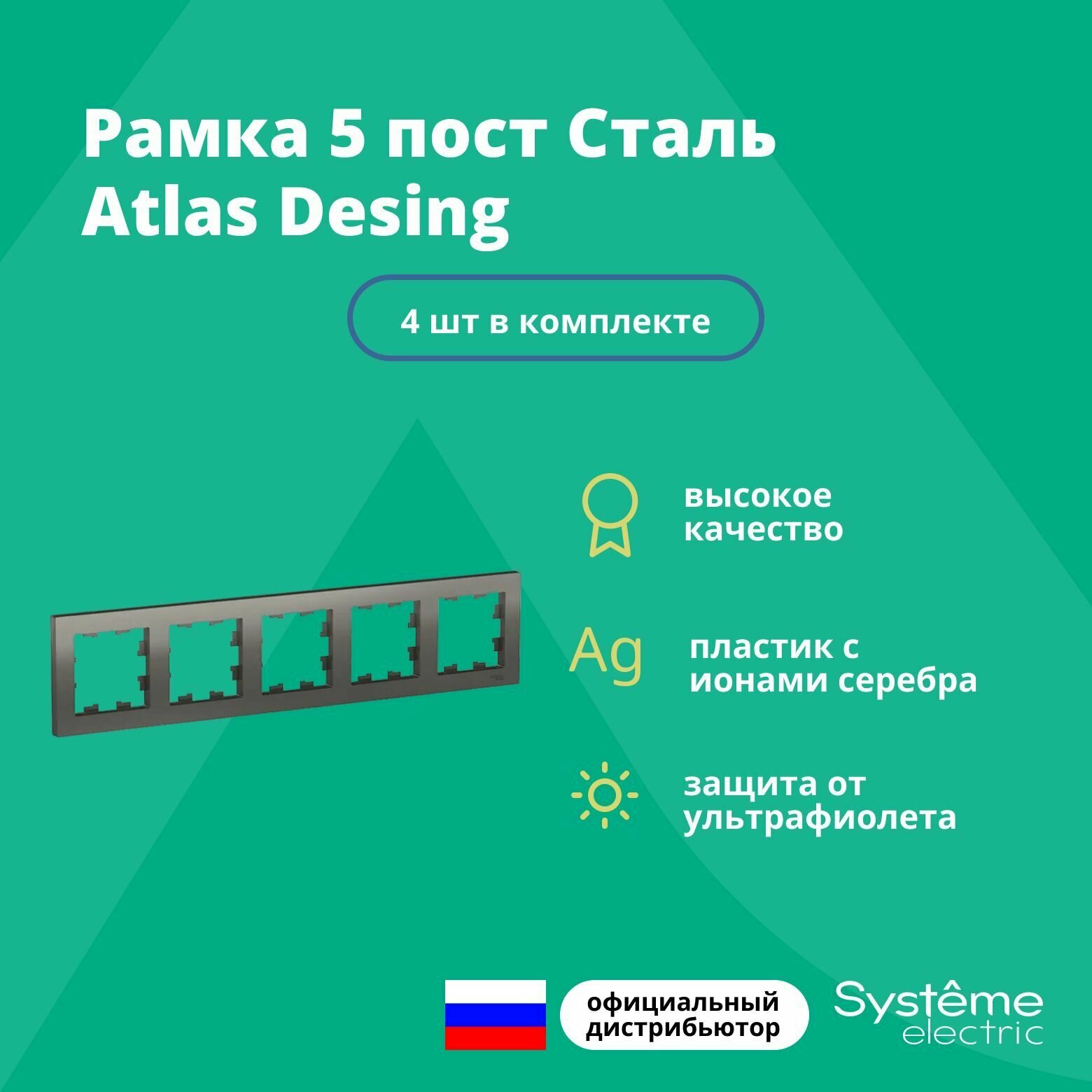 Рамка для розетки выключателя пятерная Schneider Electric (Systeme Electric) Atlas Design Антибактериальное покрытие сталь ATN000905 4шт информация: