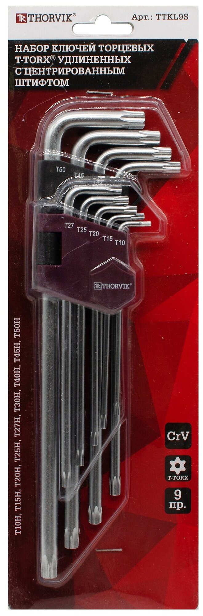 THORVIK TTKL9S Набор ключей торцевых T-TORX® удлиненных с центрированным штифтом Т10H-T50H 9 предметов 1шт