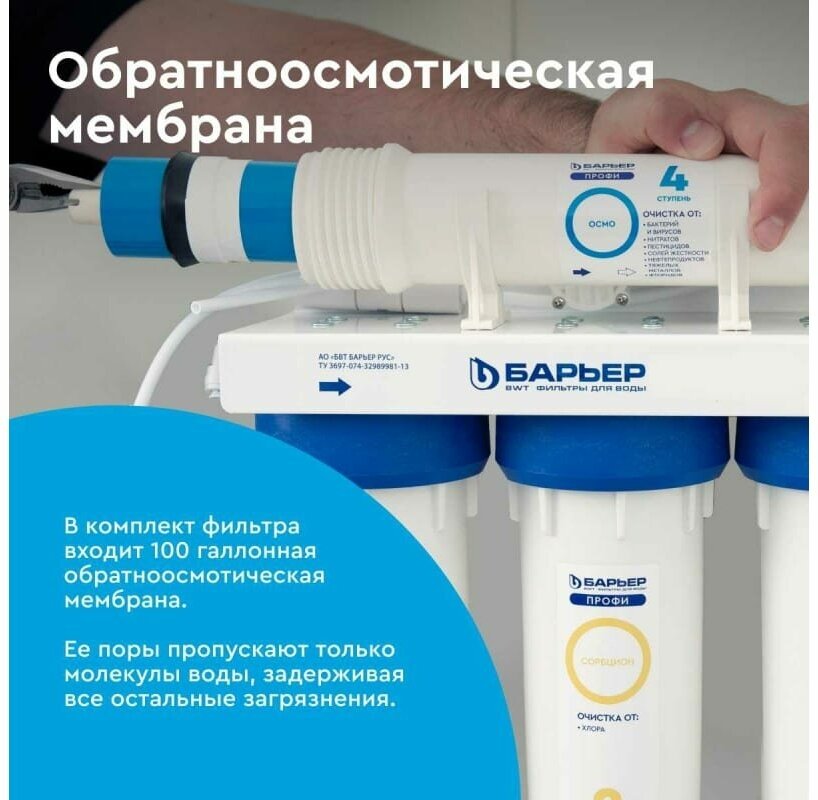Фильтр под мойку для очистки воды пятиступенчатый c технологией обратного осмоса БАРЬЕР профи Осмо 100, без крана информация:
