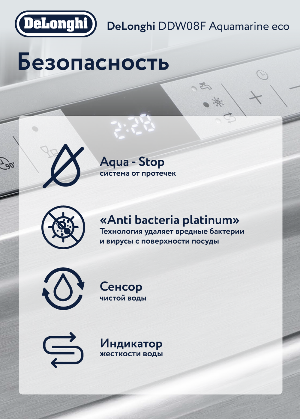 Встраиваемая посудомоечная машина DeLonghi DDW 08F Aquamarine eco, 60 см, инверторный мотор, 14 комплектов, сенсорное управление информация: