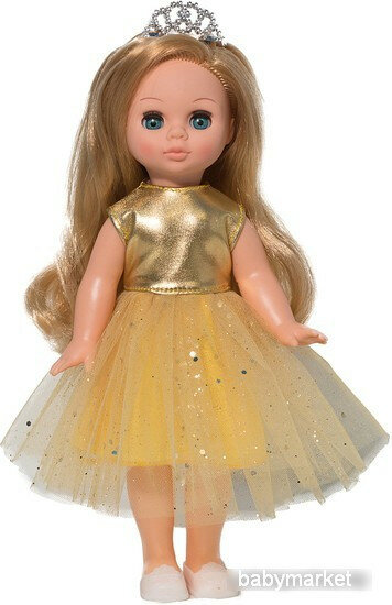 | Комплектация | кукла в одежде (нарядное, золотистое, пышное платье из трикотажной парчи и сетки с блестками), диадема, туфельки |