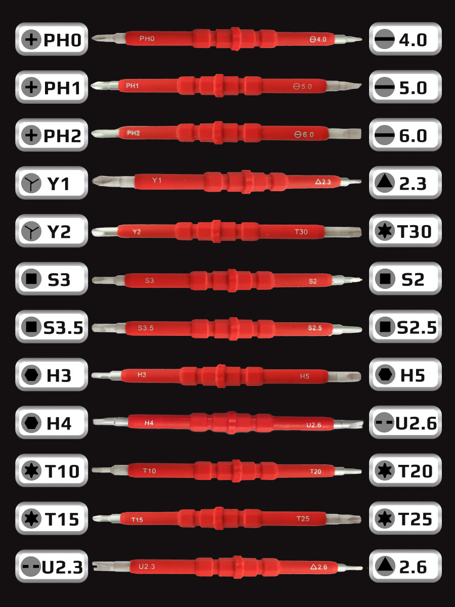| Отвертки подробно | PH0, PH1, PH2, Y1, Y2, S3, S3.5, H3, S2, S2.5, H5, H4, U2.6, T10, T20, T15, T25, U2.3 |