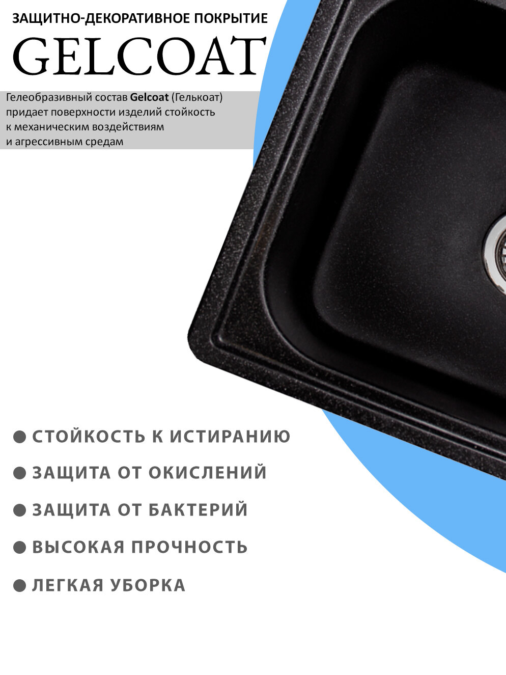 Врезная мойка для кухни из искусственного камня GranAlliance, черная с сифоном (645х495х200) информация: