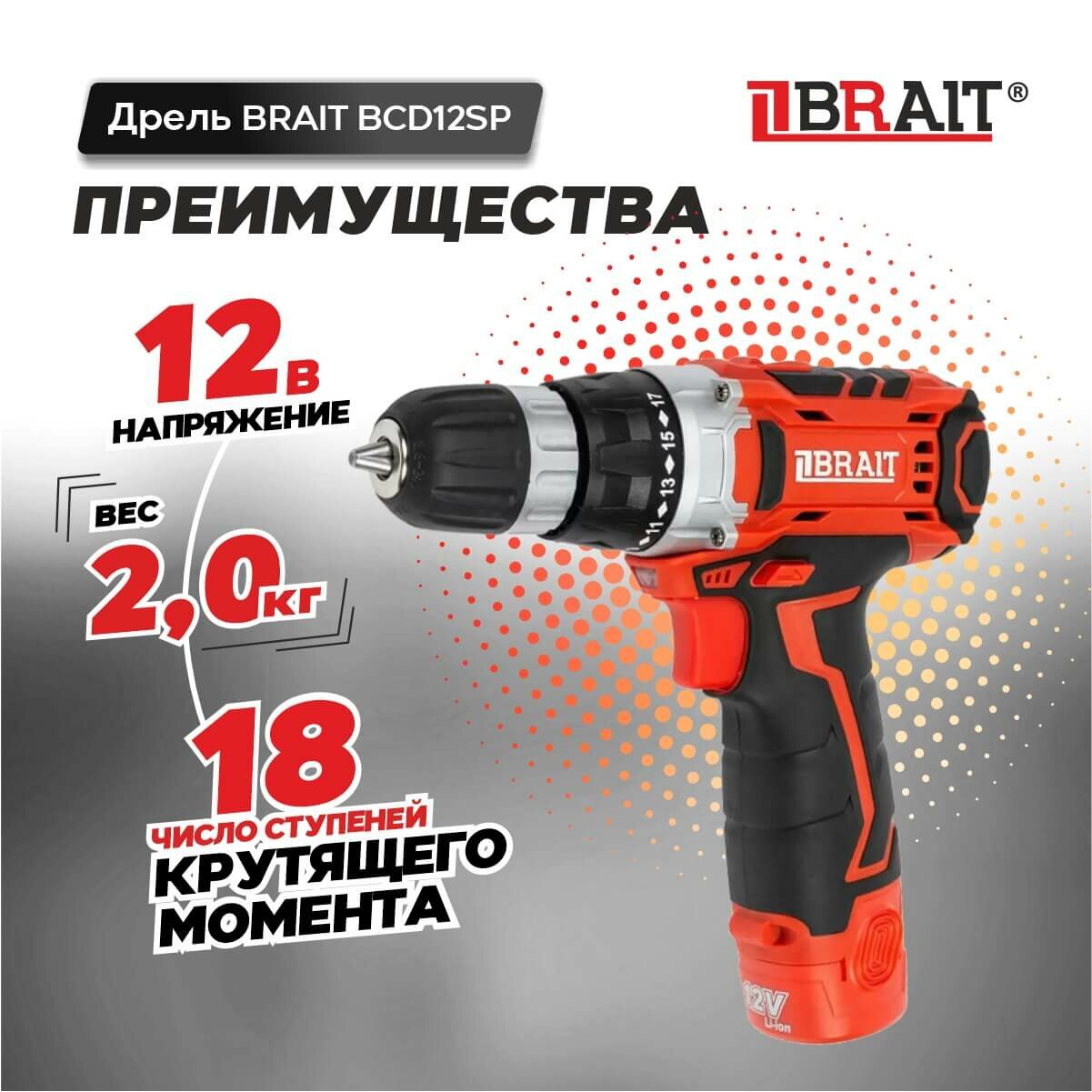 Дрель аккумуляторная BRAIT BCD12SP (12В Li-ion; 2 акк.1,5Ач, регулир.скор., 22Нм) информация: